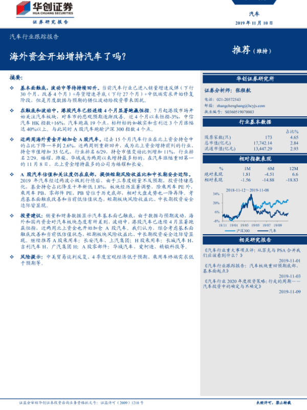 【华创证券】【20191110】20191110-华创证券-汽车行业跟踪报告:海外资金开始增持汽车了吗?-16页 行业研究