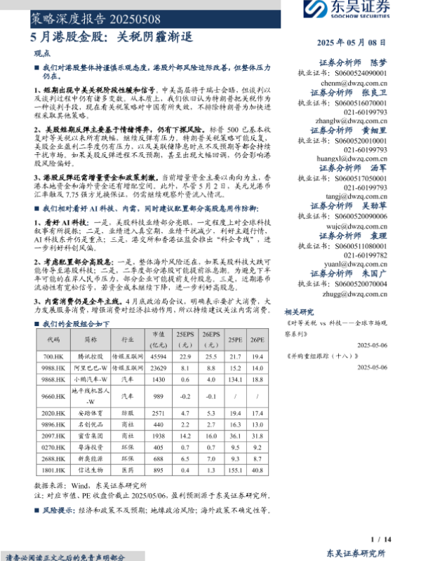 【东吴证券】【20250508】策略深度报告:5月港股金股,关税阴霾渐退-14页 证券期货研究报告
