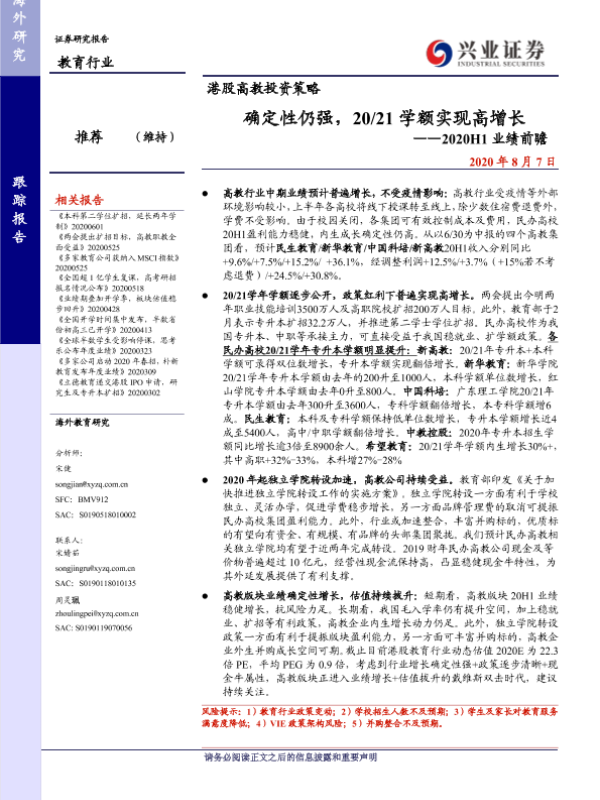 【兴业证券】【20200807】确定性仍强,20/21学额实现高增长——2020H1业绩前瞻-7页 行业研究