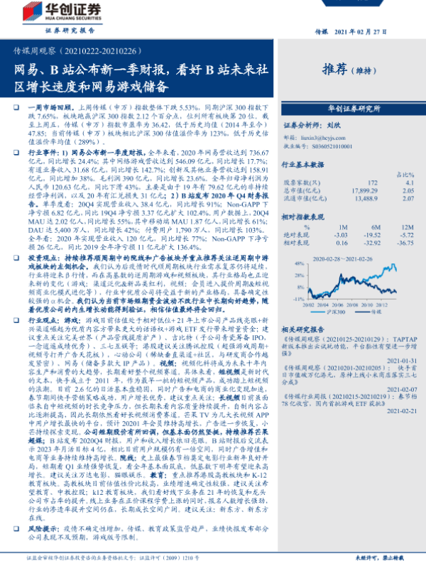 【华创证券】【20210227】20210227-华创证券-传媒周观察:网易、B站公布新一季财报,看好B站未来社区增长速度和网易游戏储备-23页 行业研究