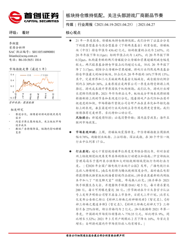 【首创证券】【20210427】20210427-首创证券-传媒行业周报:板块持仓维持低配,关注头部游戏厂商新品节奏-14页 行业研究