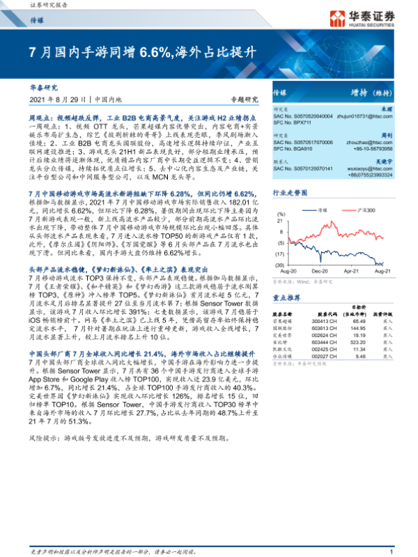 【华泰证券】【20210829】7月国内手游同增6.6%,海外占比提升-13页 行业研究