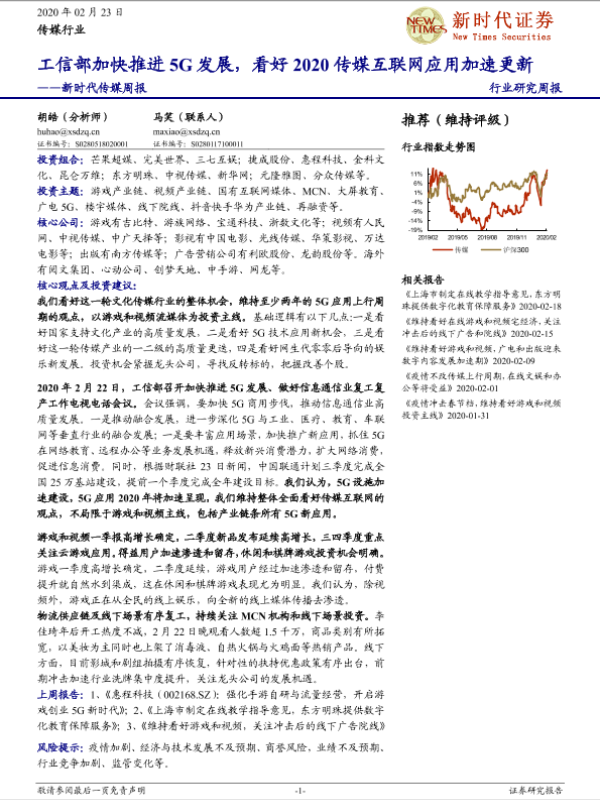 【新时代证券】【20200223】新时代证券-新时代传媒周报:工信部加快推进5G发展,看好2020传媒互联网应用加速更新-29页 行业研究