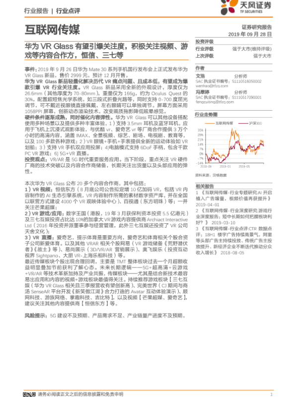 【天风证券】【20190928】互联网传媒:华为VRGlass有望引爆关注度,积极关注视频、游戏等内容合作方,恒信、三七等-3页 行业研究