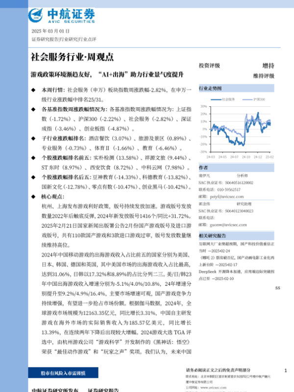 【中航证券】【20250301】社会服务行业·周观点:游戏政策环境渐趋友好,“AI+出海”助力行业景气度提升-10页 行业研究