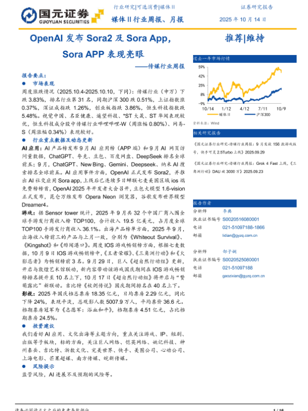 【国元证券】【202510】OpenAI发布 Sora2及 Sora App, Sora APP表现亮眼——传媒行业周报-16页 证券期货研究报告