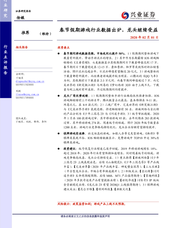 【兴业证券】【20200201】春节假期游戏行业数据出炉,龙头继续受益-18页 行业研究