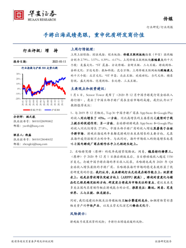 【华安证券】【20210111】20210111-华安证券-传媒行业周报:手游出海成绩亮眼,重申优质研发商价值-19页 行业研究