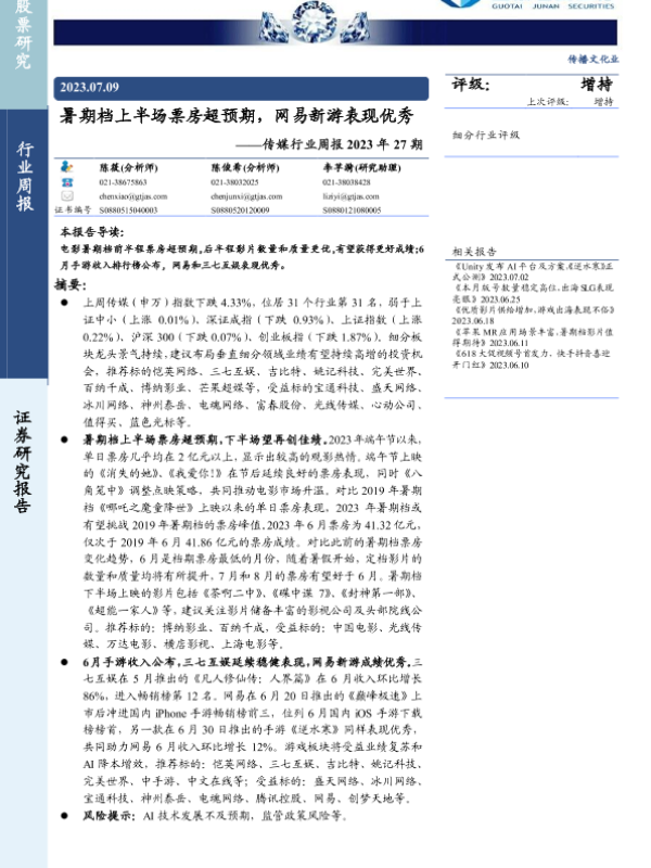 【国泰君安证券】【20230709】暑期档上半场票房超预期,网易新游表现优秀-17页 行业研究