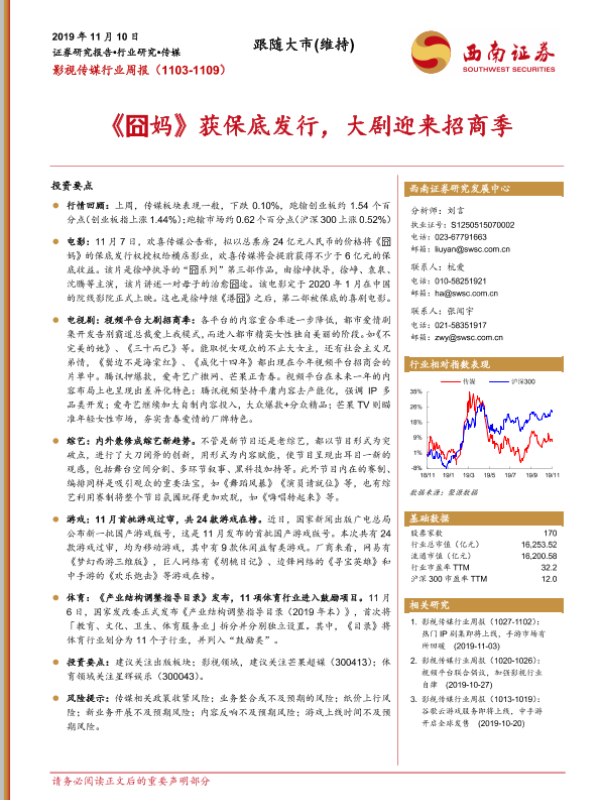 【西南证券】【20191110】20191110-西南证券-影视传媒行业周报:《囧妈》获保底发行,大剧迎来招商季-14页 行业研究