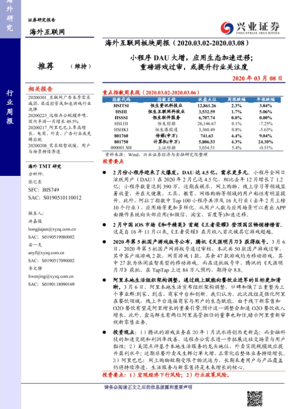 【兴业证券】【20200308】海外互联网板块周报:小程序DAU大增,应用生态加速迁移;重磅游戏过审,或提升行业关注度-21页 行业研究