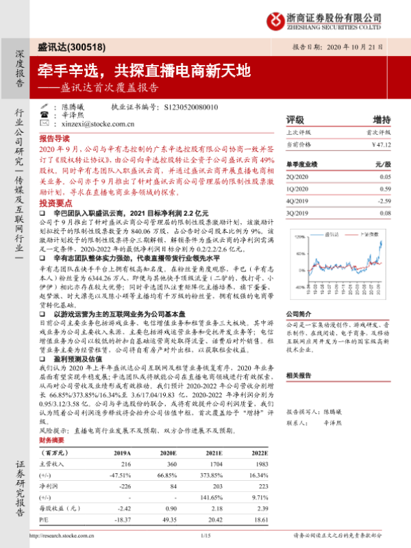 【浙商证券】【20201021】盛讯达首次覆盖报告:牵手辛选,共探直播电商新天地-15页 行业研究