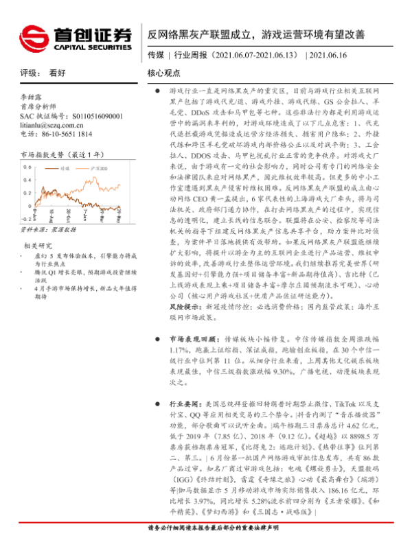 【首创证券】【20210616】20210616-首创证券-传媒行业周报:反网络黑灰产联盟成立,游戏运营环境有望改善-11页 行业研究