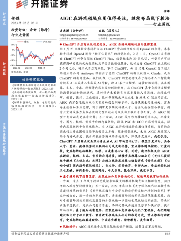 【开源证券】【20230205】传媒行业周报:AIGC在游戏领域应用值得关注,继续布局线下教培-15页 行业研究