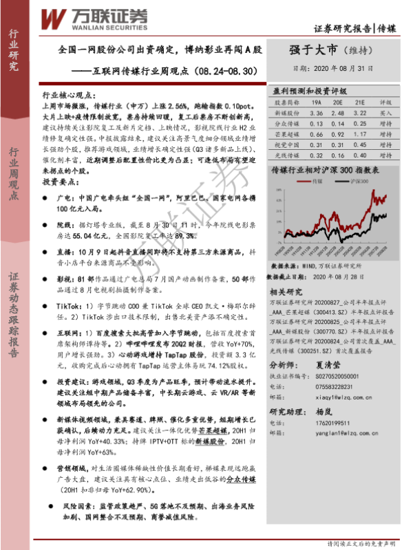 【万联证券】【20200831】互联网传媒行业周观点:全国一网股份公司出资确定,博纳影业再闯A股-21页 行业研究