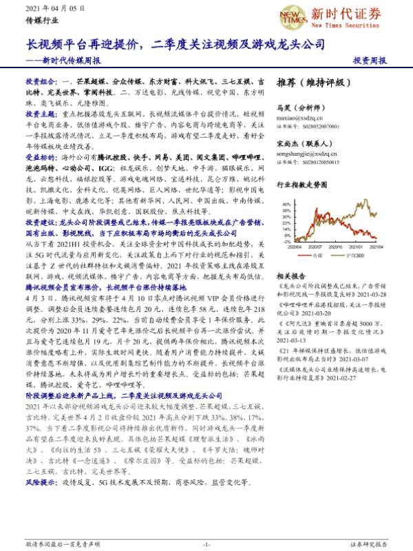 【新时代证券】【20210405】新时代传媒周报:长视频平台再迎提价,二季度关注视频及游戏龙头公司-27页 行业研究