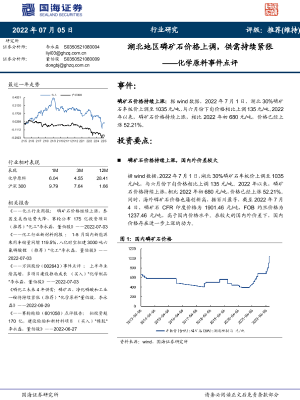 【国海证券】【20220705】化学原料事件点评:湖北地区磷矿石价格上调,供需持续紧张-6页 行业研究