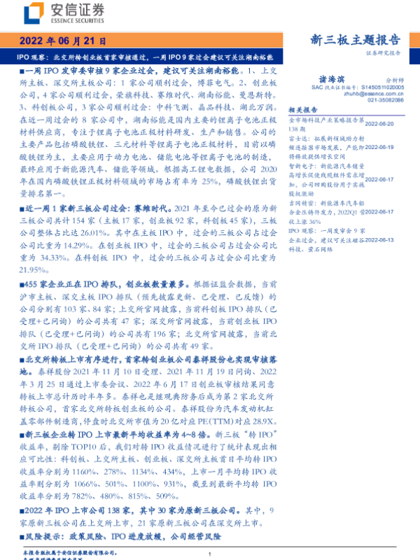 【安信证券】【20220621】IPO观察:北交所转创业板首家审核通过,一周IPO 9家过会建议可关注湖南裕能-22页 行业研究