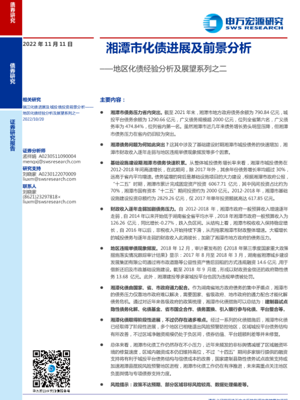 【申万宏源】【20221111】地区化债经验分析及展望系列之二:湘潭市化债进展及前景分析-15页 行业研究