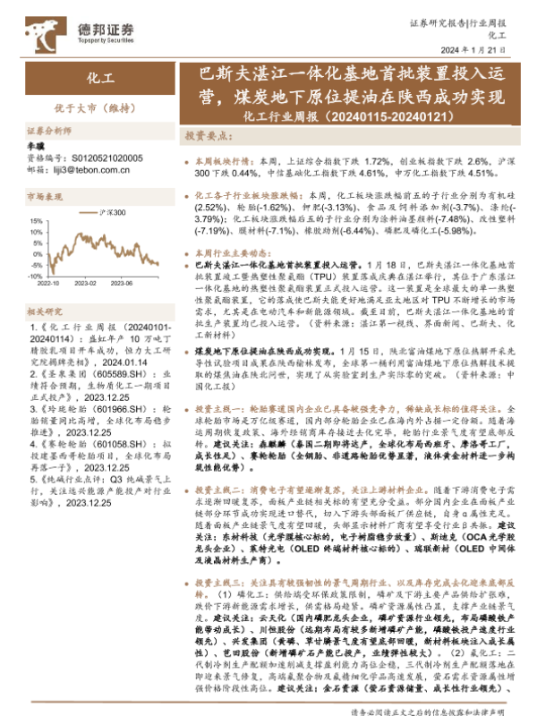 【德邦证券】【20240121】20240121-德邦证券-化工行业周报:巴斯夫湛江一体化基地首批装置投入运营,煤炭地下原位提油在陕西成功实现-24页 行业研究