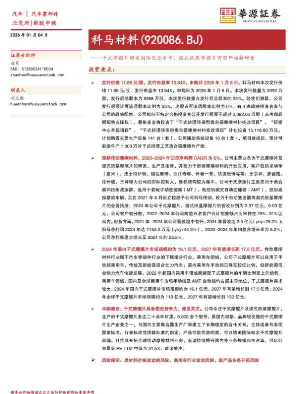 【华源证券】【202601】科马材料(920086.BJ)——干式摩擦片媲美国际先进水平,湿式纸基摩擦片有望开拓新增量-19页 证券期货研究报告