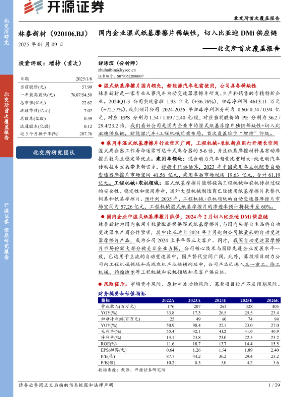 【开源证券】【20250109】林泰新材(920106)北交所首次覆盖报告:国内企业湿式纸基摩擦片稀缺性,切入比亚迪DMi供应链-29页 行业研究