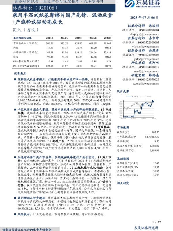 【东吴证券】【20250706】林泰新材(920106)乘用车湿式纸基摩擦片国产先锋,混动放量+产能释放驱动高成长-27页 公司研究