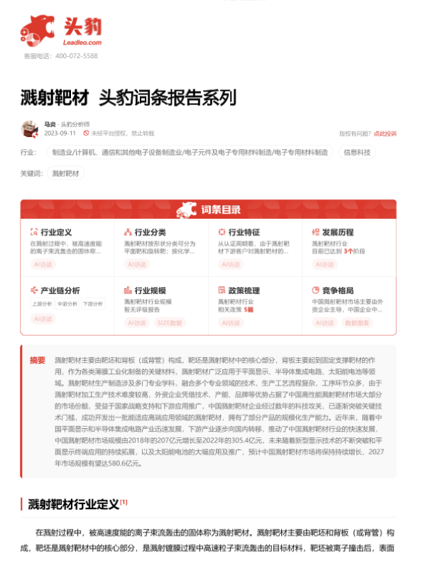 【头豹研究院】【20230911】溅射靶材 头豹词条报告系列-18页 行业研究