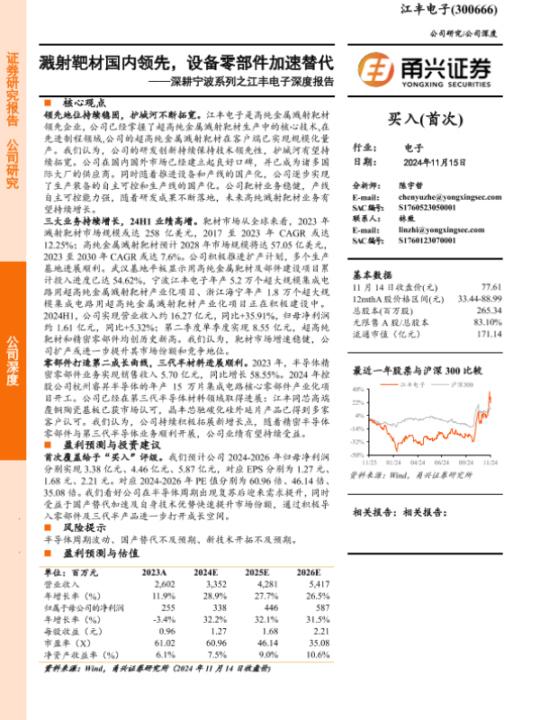 【甬兴证券】【20241115】江丰电子深度报告:溅射靶材国内领先,设备零部件加速替代-25页 行业研究