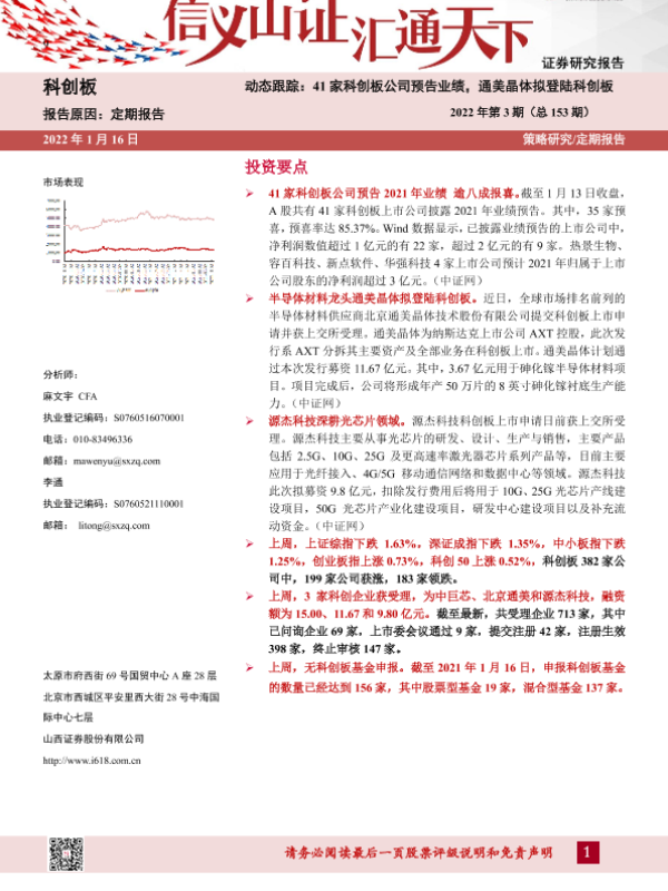 【山西证券】【20220116】动态跟踪2022年第3期(总153期):41家科创板公司预告业绩,通美晶体拟登陆科创板-23页 行业研究