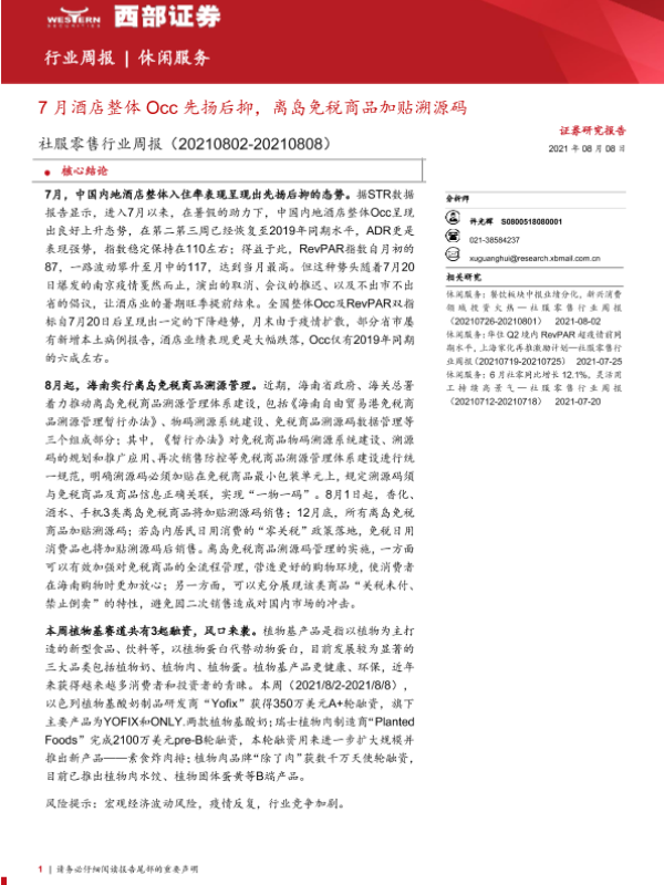 【西部证券】【20210809】7月酒店整体Occ先扬后抑,离岛免税商品加贴溯源码-13页 行业研究