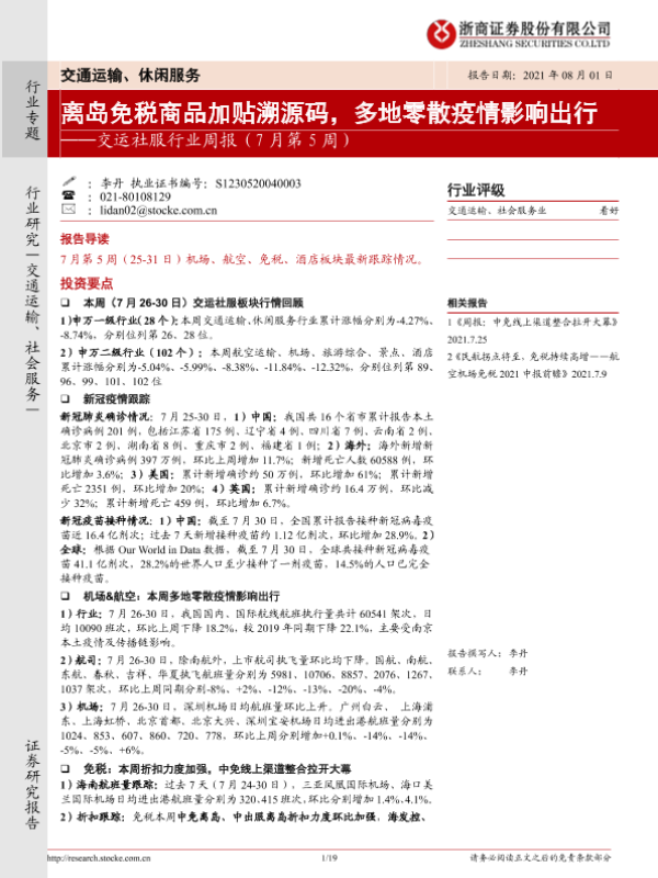 【浙商证券】【20210801】交运社服行业周报:离岛免税商品加贴溯源码,多地零散疫情影响出行-19页 行业研究