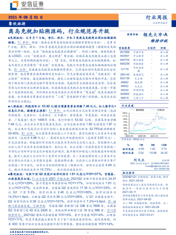 【安信证券】【20210801】餐饮旅游行业周报:离岛免税加贴溯源码,行业规范再升级-13页 行业研究