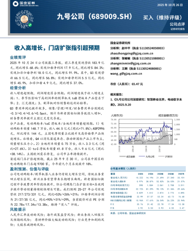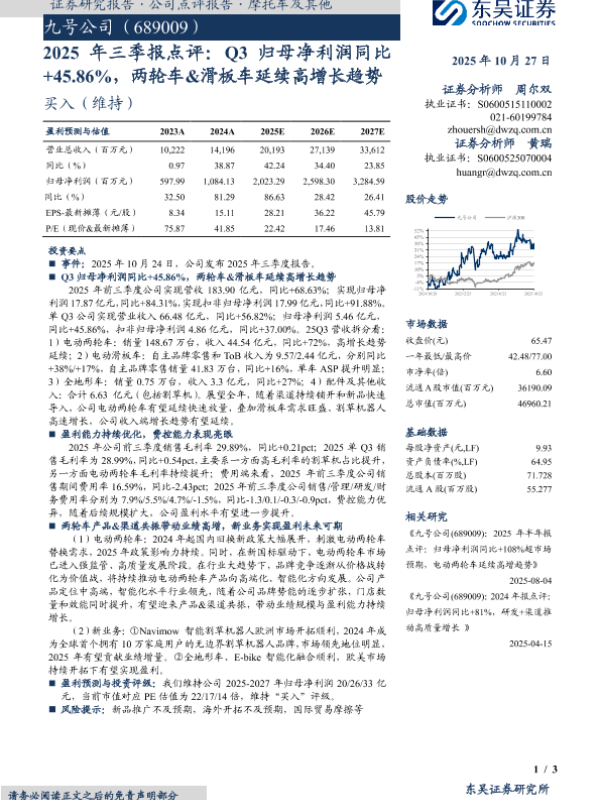 【东吴证券】【202510】2025年三季报点评:Q3归母净利润同比+45.86%,两轮车&滑板车延续高增长趋势-3页 证券期货研究报告