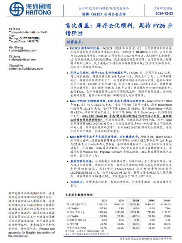 【海通国际】【20241220】滔搏(06110.HK)首次覆盖:库存去化顺利,期待FY26业绩弹性-12页 行业研究