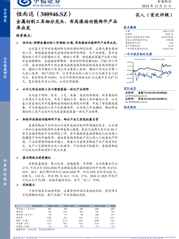【华福证券】【20241231】恒而达(300946.SZ):金属切削工具细分龙头,布局滚动功能部件产品再出发-22页 行业研究