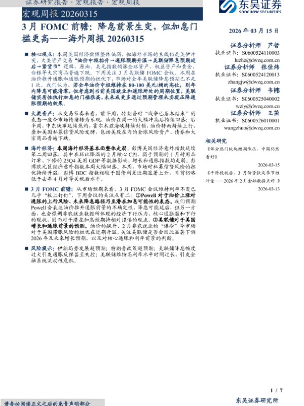 【东吴证券】【202603】3月FOMC前瞻:降息前景生变,但加息门槛更高——海外周报 20260315-7页 证券期货研究报告