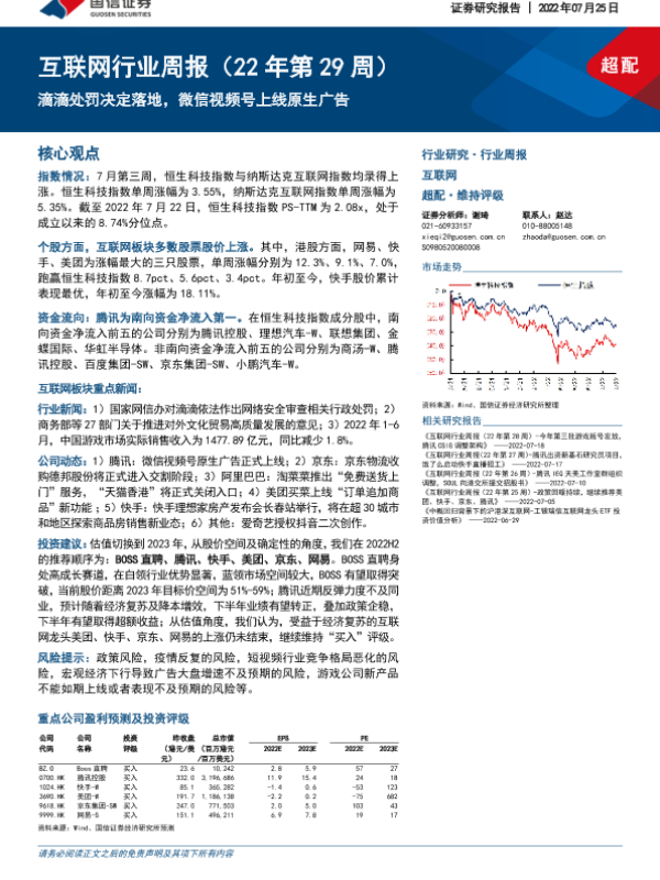 【国信证券】【20220725】20220725-国信证券-互联网行业周报(22年第29周):滴滴处罚决定落地,微信视频号上线原生广告-13页 行业研究