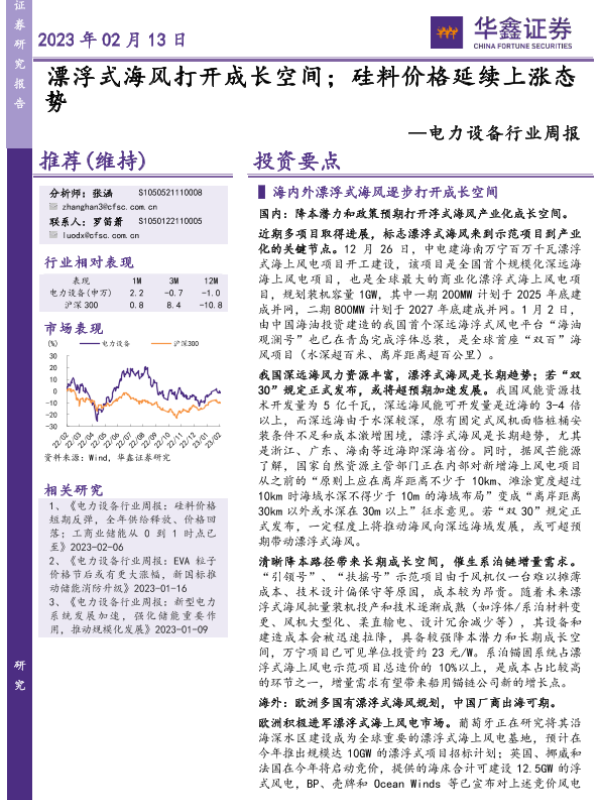 【华鑫证券】【20230213】电力设备行业周报:漂浮式海风打开成长空间;硅料价格延续上涨态势-14页 行业研究