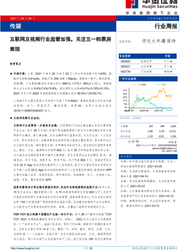 【华金证券】【20210504】20210504-华金证券-传媒行业周报:互联网及视频行业监管加强,关注五一档票房表现-18页 行业研究