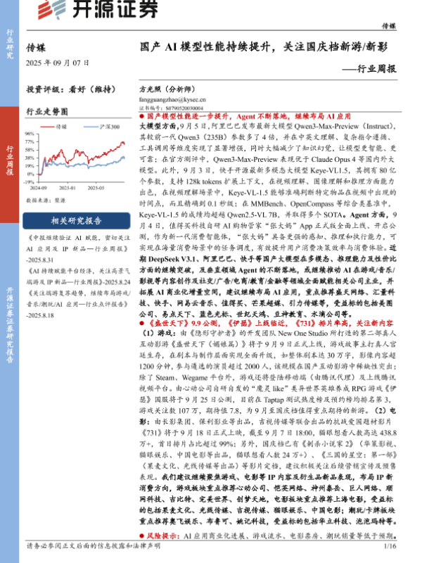 【开源证券】【202509】国产AI模型性能持续提升,关注国庆档新游 新影-16页 证券期货研究报告