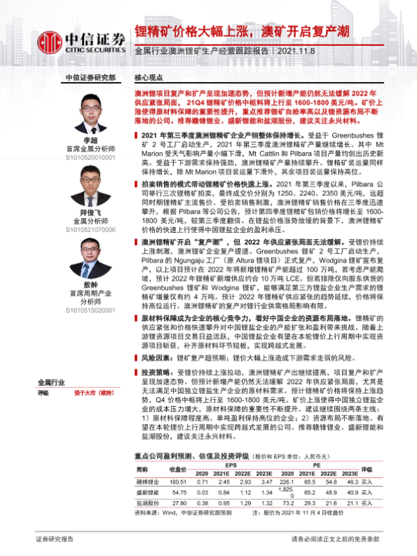 【中信证券】【20211108】金属行业澳洲锂矿生产经营跟踪报告:锂精矿价格大幅上涨,澳矿开启复产潮-25页 行业研究