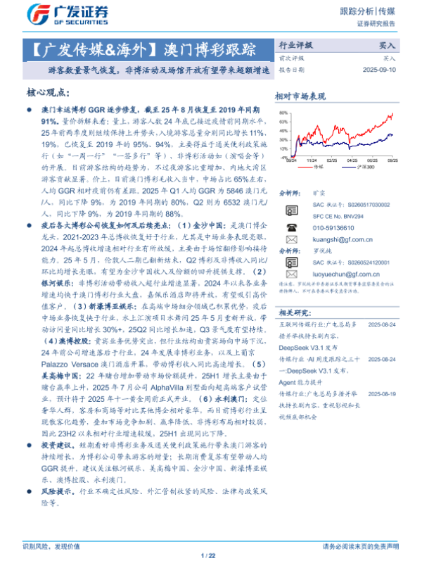 【广发证券】【202509】澳门博彩跟踪:游客数量景气恢复,非博活动及场馆开放有望带来超额增速-22页 证券期货研究报告