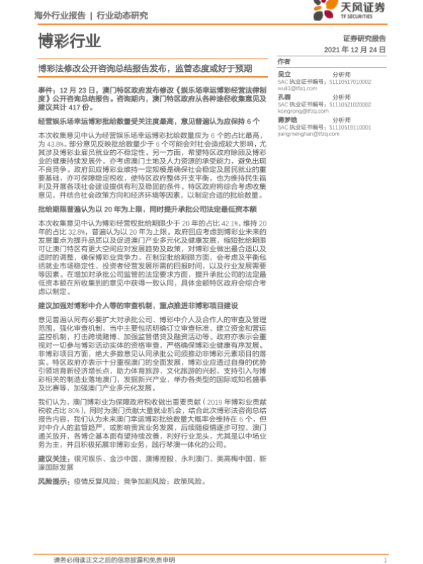 【天风证券】【20211224】博彩法修改公开咨询总结报告发布,监管态度或好于预期-2页 行业研究