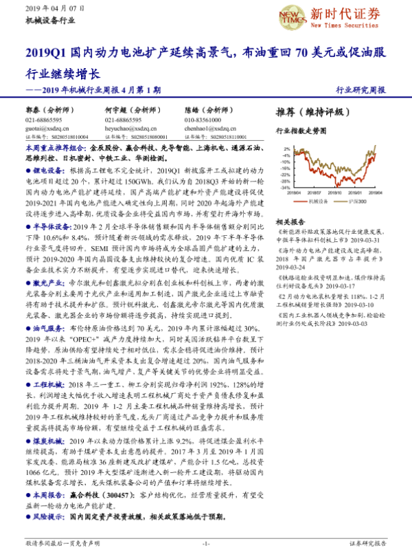 【新时代证券】【20190407】2019年机械行业周报4月第1期:2019Q1国内动力电池扩产延续高景气,布油重回70美元或促油服行业继续增长-15页 行业研究