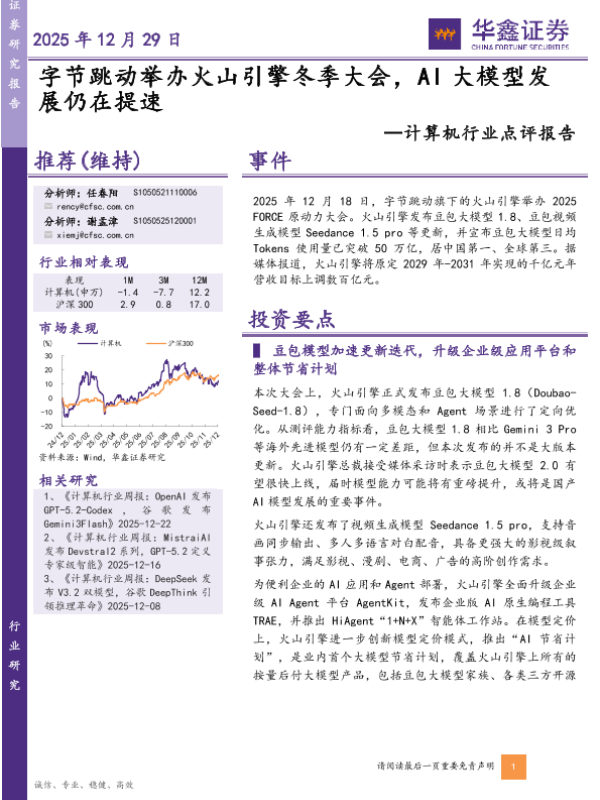【华鑫证券】【202512】字节跳动举办火山引擎冬季大会,AI大模型发展仍在提速-4页 证券期货研究报告