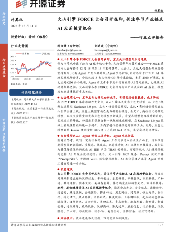 【开源证券】【202512】火山引擎FORCE大会召开在即,关注字节产业链及AI应用投资机会-3页 证券期货研究报告