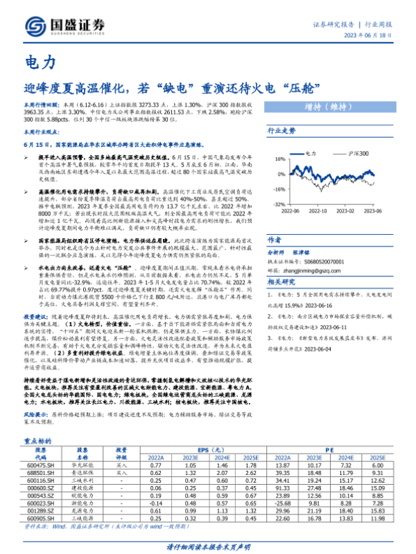 【国盛证券】【20230618】电力行业周报:迎峰度夏高温催化,若“缺电”重演还待火电“压舱”-15页 行业研究