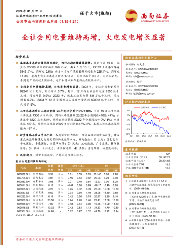 【西南证券】【20240121】公用事业与环保行业周报:全社会用电量维持高增,火电发电增长显著-19页 行业研究