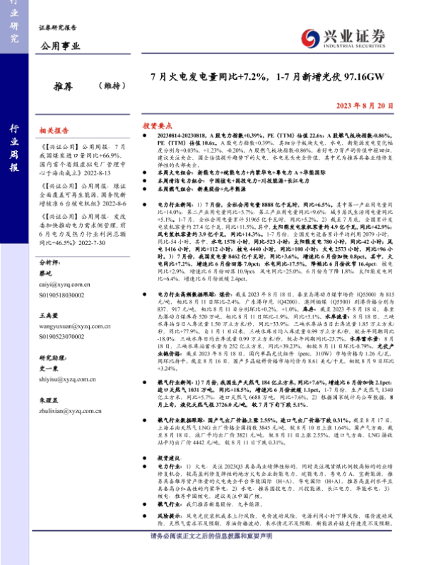 【兴业证券】【20230820】7月火电发电量同比+7.2%,1-7月新增光伏97.16GW-25页 行业研究